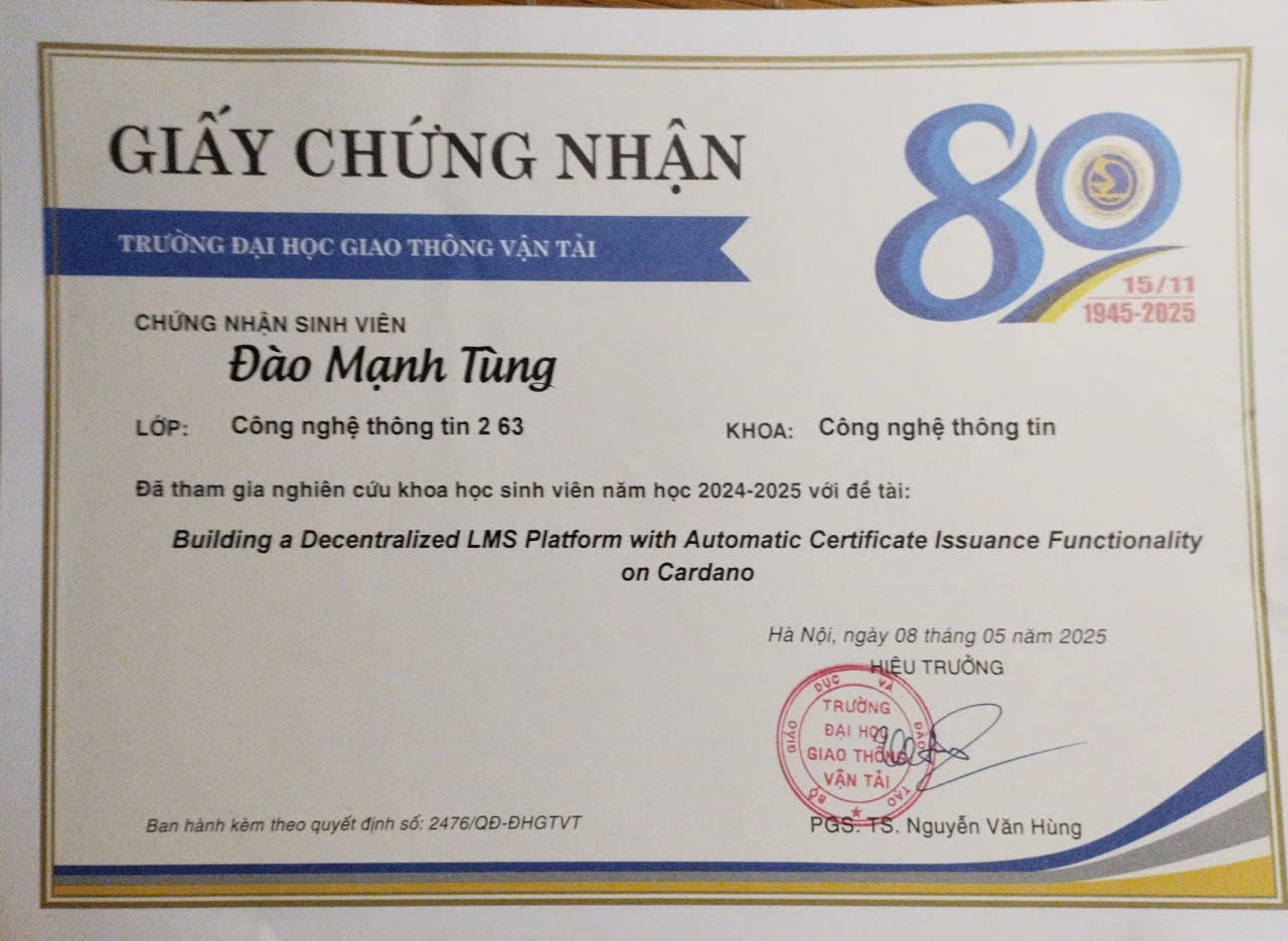 - 3rd Place – Scientific Research Competition: Decentralized LMS with Blockchain Certificates on Cardano